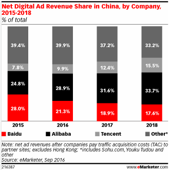 在國(guó)內(nèi),把持?jǐn)?shù)字廣告市場(chǎng)的則是 BAT 三巨頭。市場(chǎng)研究公司 eMarketer 在最近發(fā)布的報(bào)告中稱,阿里巴巴、百度和騰訊共同占據(jù)了中國(guó)數(shù)字廣告市場(chǎng) 60% 的份額。預(yù)計(jì)阿里巴巴將超越百度,成為中國(guó)數(shù)字廣告市場(chǎng)上最大的玩家。