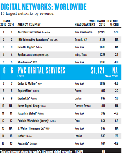 在很多人看來(lái),戰(zhàn)略咨詢才是屬于咨詢公司的業(yè)務(wù)范疇。而事實(shí)上,咨詢公司與廣告公司的界限正在日益模糊。根據(jù)廣告媒體 Adage 發(fā)布的榜單顯示,埃森哲互動(dòng)、IBM 互動(dòng)體驗(yàn)部、德勤數(shù)字和普華永道數(shù)字已經(jīng)躋身世界 10 大數(shù)字營(yíng)銷(xiāo)集團(tuán)之列。而在 2011 年,上榜的咨詢公司還僅僅只有IBM。