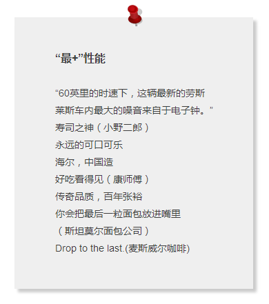用一句話或一個(gè)詞語,表達(dá)出品牌的某種極致屬性、品牌檔次地位、品牌的極致理念追求、品牌的最優(yōu)市場表現(xiàn)。