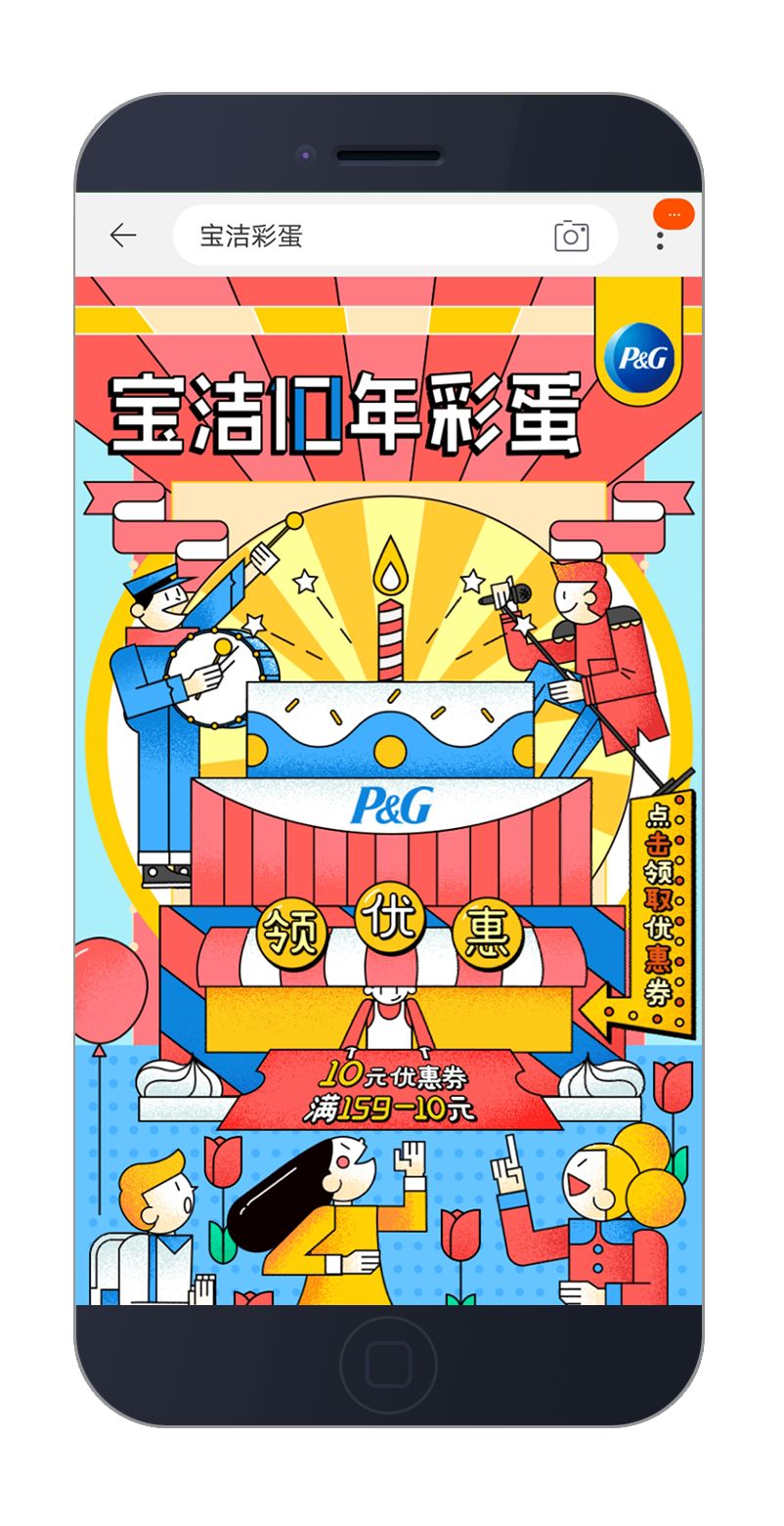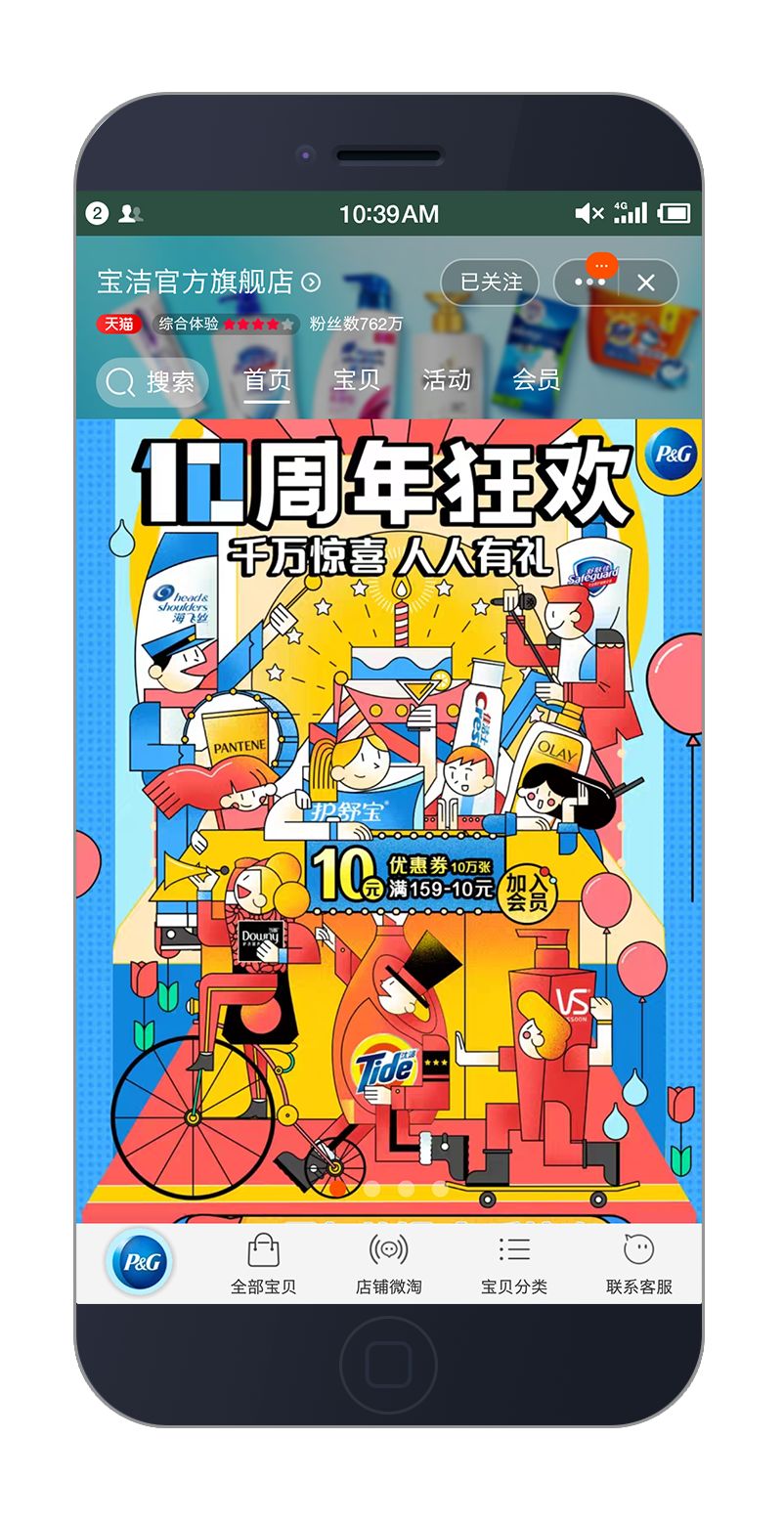 在店慶期間,寶潔天貓旗艦店還進(jìn)行了一次限時(shí)大變身,化身歡樂(lè)的生日會(huì)場(chǎng)。