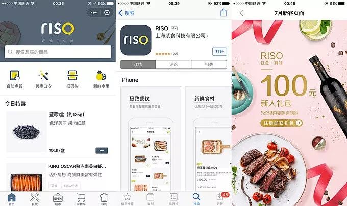 1)RISO手機(jī)端APP、微信小程序同步上線(xiàn),門(mén)店和線(xiàn)上商品庫(kù)存打通、會(huì)員打通,提供基于門(mén)店周邊3-5公里1小時(shí)送達(dá)的配送服務(wù),門(mén)店內(nèi)的所有餐飲檔口也都可以提供外送服務(wù)。APP與小程序還提供自助點(diǎn)餐、掃碼支付、自助結(jié)賬等功能。