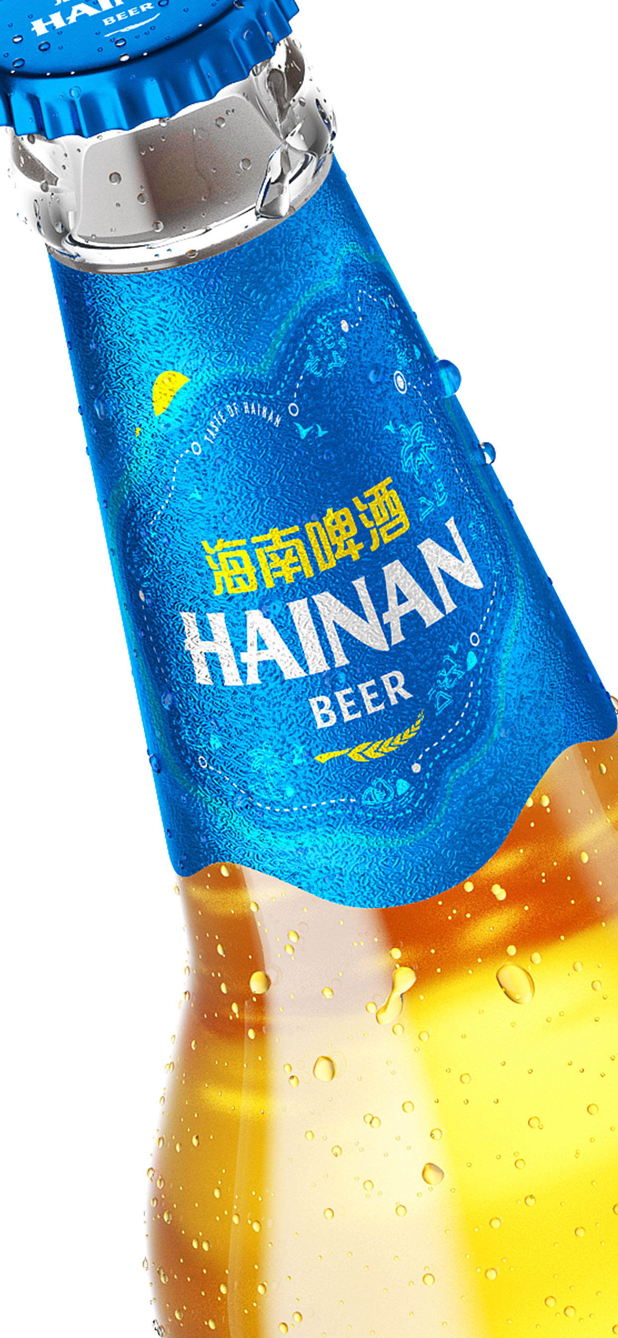 海南啤酒的包裝設(shè)計(jì)創(chuàng)意靈感來自于“浪”,結(jié)合海南本土元素再設(shè)計(jì),提取海浪、海鷗的形狀,通過文字變形處理,將元素以圖像化表現(xiàn),賦予海南啤酒的新鮮活力。圓潤、律動(dòng)的圖形文字,體現(xiàn)海南的舒適自由度,將悠然愜意的感覺融入設(shè)計(jì)之中。主圖形放大化,突破常規(guī)設(shè)計(jì)局限,形成強(qiáng)烈的視覺沖擊力。
