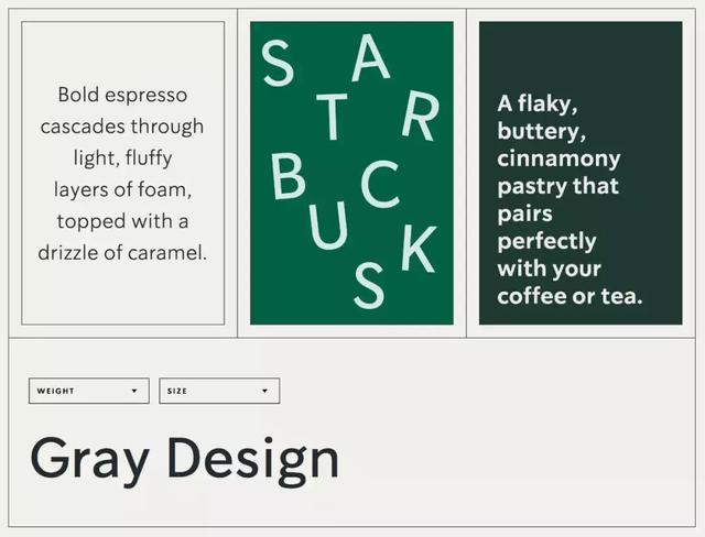 現(xiàn)在很多品牌都是量身定制字體,星巴克使用了三種不同字體滿足于標(biāo)題、正文等使用范圍??梢愿鶕?jù)不同情況調(diào)整字號大小。