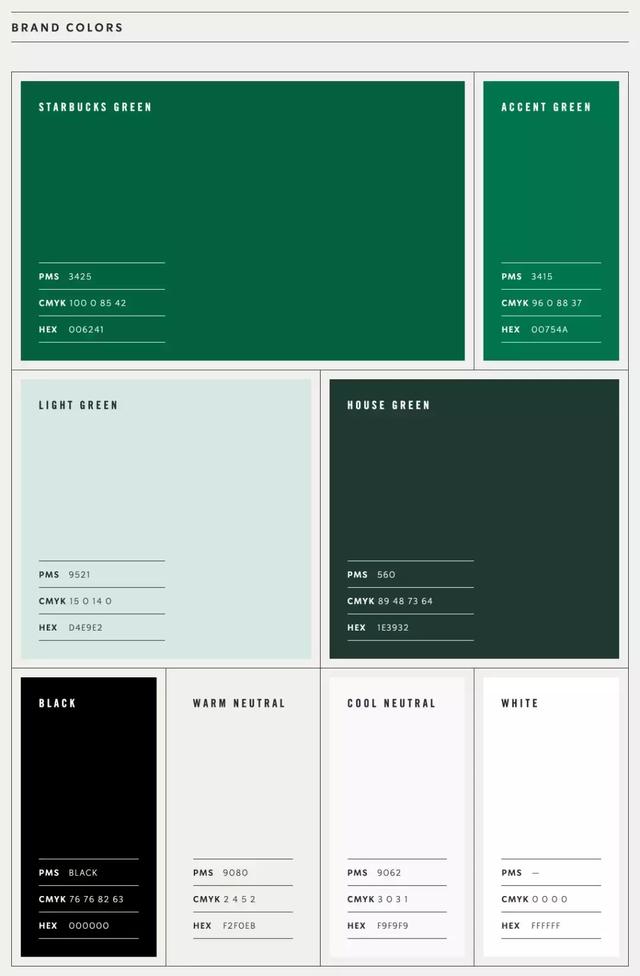 綠色是星巴克品牌主色,根據(jù)品牌主色還設(shè)定了一些輔助顏色。這樣的搭配看起來是那么的和諧。