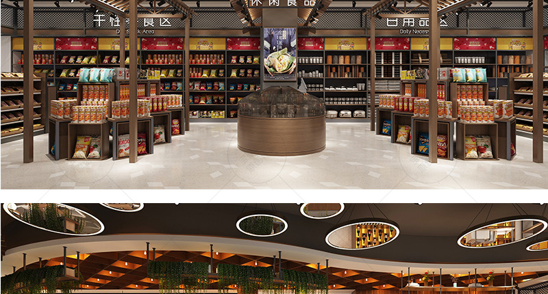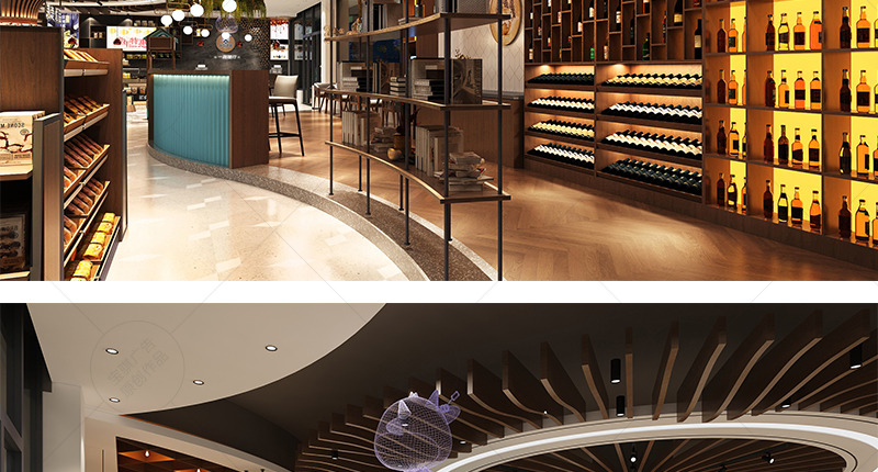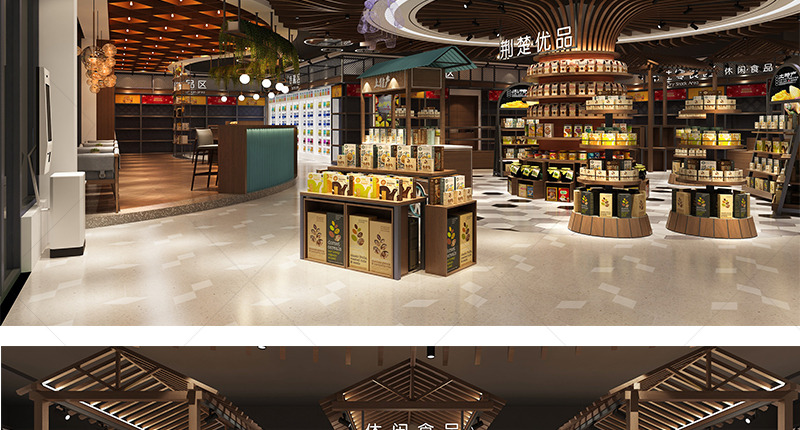 針對高速服務區(qū)的特殊屬性,重點考慮如何吸引顧客進店購物,通過整體氛圍營造,同事運用不同燈光效果。圍繞建筑結(jié)構原有立柱區(qū)域,設計圓形吊頂與弧形貨架完美結(jié)合,重點打造湖北特產(chǎn)“荊楚優(yōu)品”。